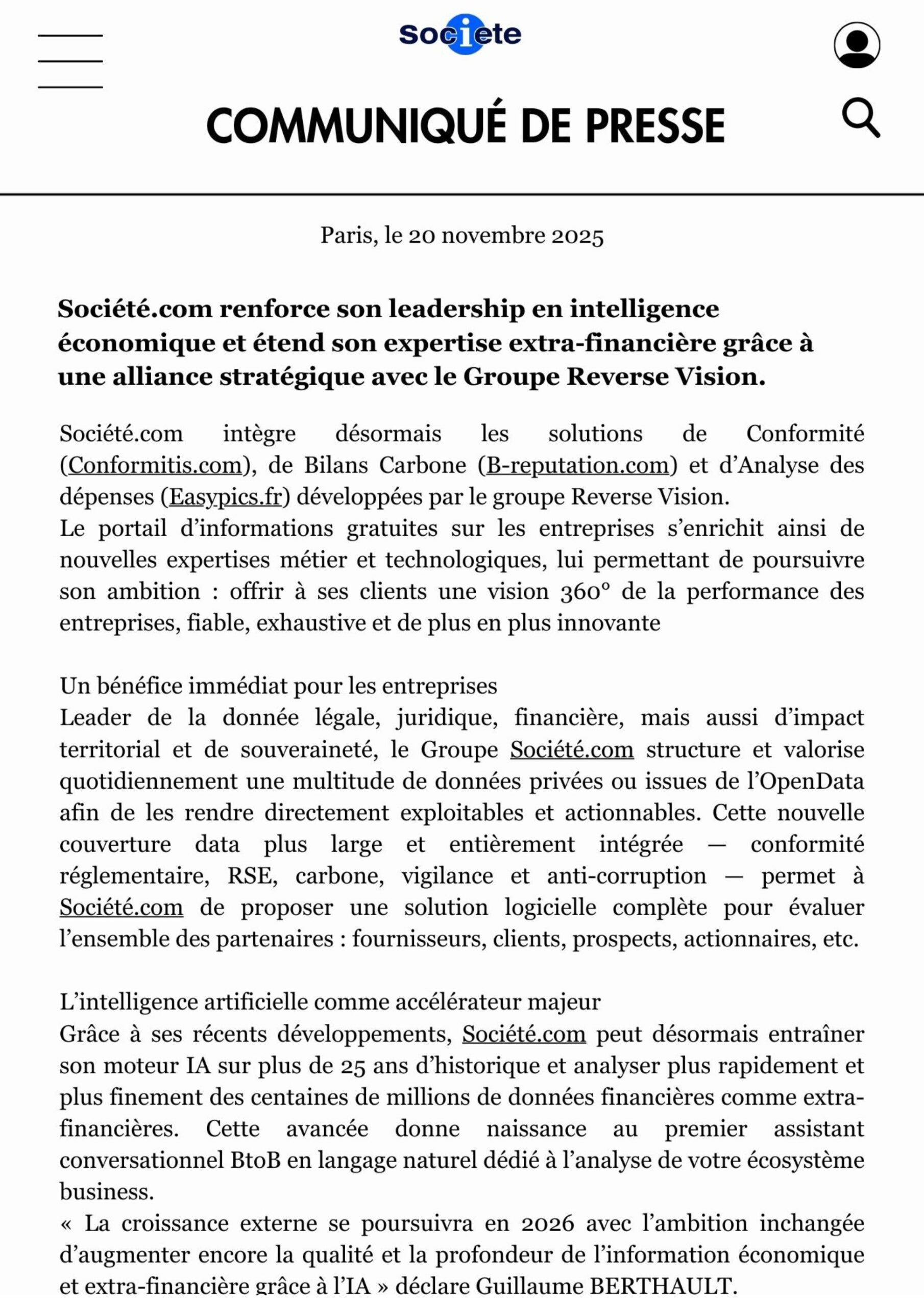 Egalement, et pour servir des ambitions long terme, ce rapprochement positionne Société.com comme le premier acteur à offrir une vision globale, fiable et opérationnelle de la performance des entreprises, couvrant à la fois les volets financier, extra-financier, fournisseur et client.